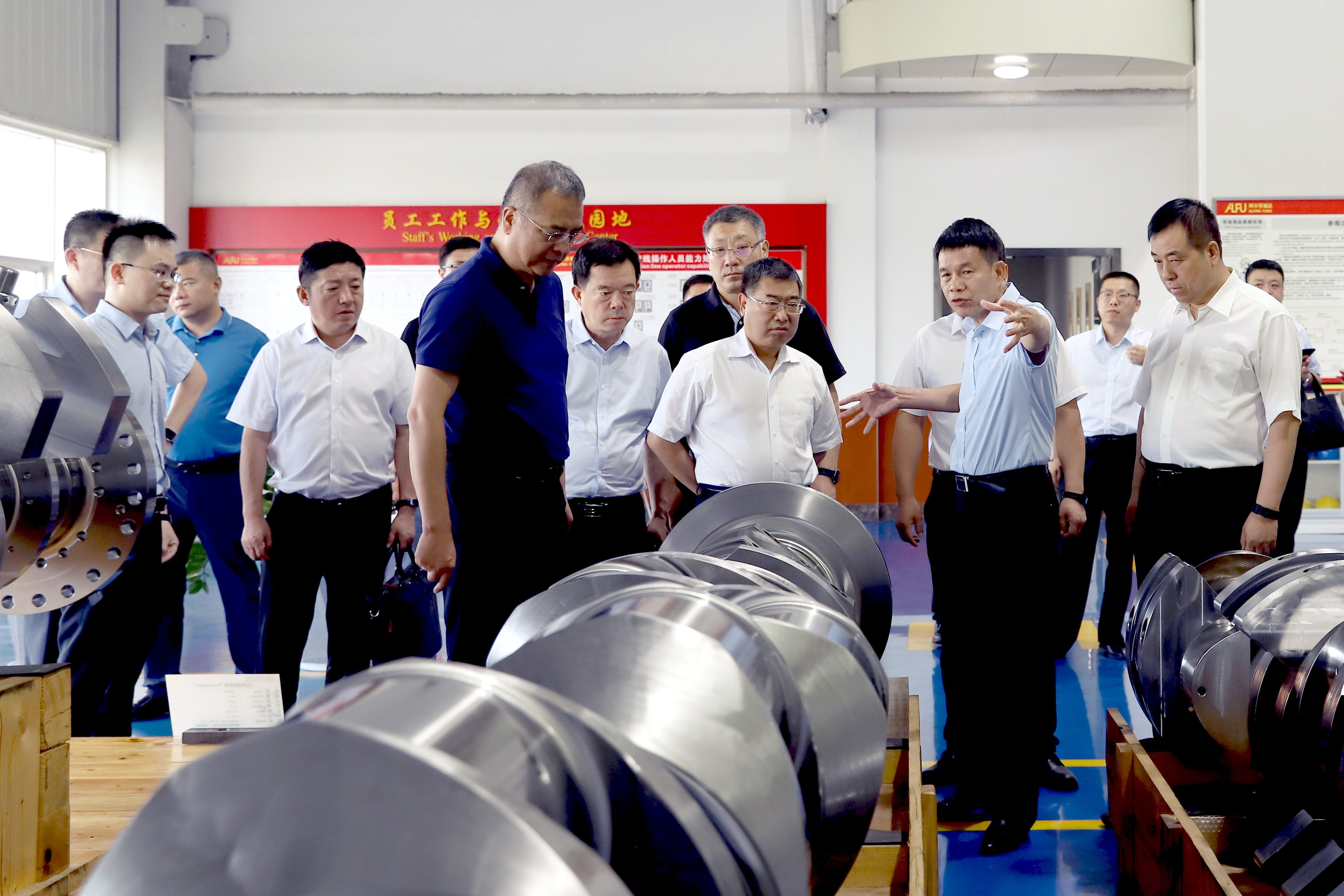 代表團一行首先來到福達股份生產區域展開調研。在桂林福達阿爾芬大型曲軸有限公司生產線上,黎福超詳細介紹了福達股份產業轉型升級的新思路,桂林福達阿爾芬合資項目將“中國制造”與“德國技術”相融合,推動福達產品由傳統汽車零部件制造進入非道路和高端機械制造領域,加快了生產方式向智能制造轉變,形成了產業發展新動能。隨后,代表團一行來到智能化曲軸分公司、離合器分公司、重工鍛造和齒輪公司進行了詳細考察。